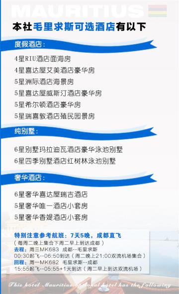 酒店享用早餐,选择你喜欢的方式,度过休闲轻松最后半天!浓浓的情淡淡的意,思念中的人是谁呢?让毛里求斯浪漫的气息环绕你,沉静下去吧!午餐后前往机场办理登机手续,离开毛里求斯