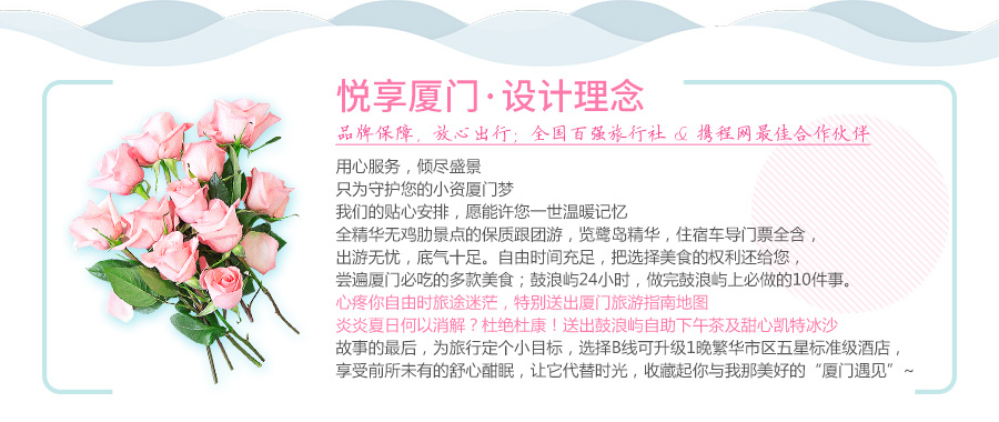 ◆厦门有许多特色名小吃,您可以在不含餐的情况下自行前往。品尝当地美食,要根据自身肠胃情况而 定, 请勿暴饮暴食,请谨慎选择下海游泳、过山车、骑马、漂流、登山、潜水等带有危险性的娱乐活动。